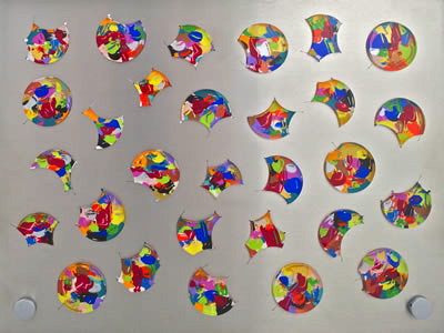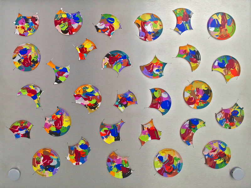 Puzzle Art is derived from the cut-out sheet from the which the metal puzzle pieces are cut. Acrylic pieces have been cut, painted, and fitted into each space. This makes for a very interesting table-top piece of art. Laser cut lines can be seen as they surround the pianted pieces. |